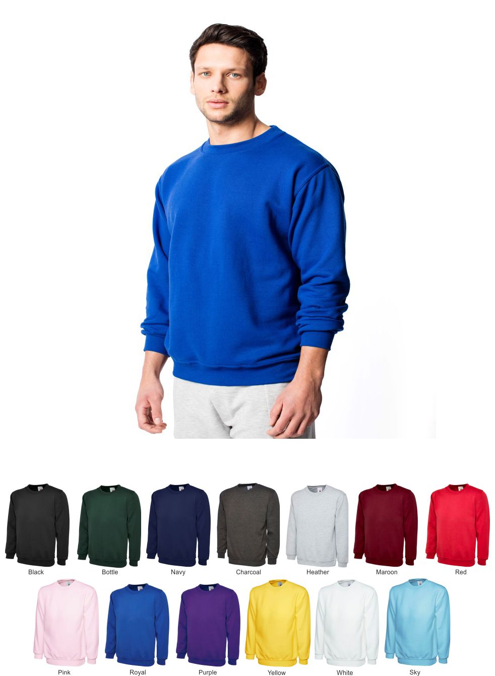 Sizes XS - 6XL Size guides Specification 50% Polyester 50% Cotton Crew Neck Reactive Dyed Set in Sleeve Lycra Ribbed Cuffs, Welt & Neck Twin Needle Stitching at Neck, Shoulders, Armholes and Sleeves Brushed Effect for Superior Comfort & Look