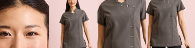 Beauty and Spa tunic with Mandarin collar. Asymmetric button fastening to the front with 8 bar shaped buttons. Short sleeve. Side vents. Back pleat for ease of movement. Princess seams. Easycare. Size 8, 10, 12, 14,16, 18, 20, 22, 24
