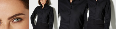 Innovative premium business shirt in a classic style. At the forefront of non-iron technology, this new fabric is designed to keep the wearer looking and feeling smart all day long. Stylish and relaxed long edged collar with fashionable twin button fastening. Shaping at the waist for flattering feminine silhouette. Double turnback hem on sleeves with rounded hem.