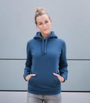 Brushed back fleece. 100% cotton outer layer. Drop shoulder style. Ladies tailored fit. Double layer hood with flat chunky drawcord. Herringbone taped neck.