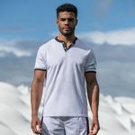 Neoteric™ polyester birdseye fabric that is quick-dry and wicks moisture away from the skin. Features button placket with contrast stand collar and cuffs