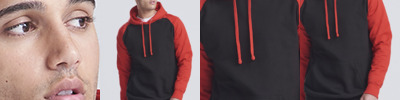 Soft cotton faced fabric. Brushed back fleece. Contrast raglan sleeves. Contrast double fabric hood with flat lace drawcord. Front pouch pocket. Ribbed cuffs and hem.