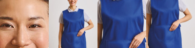 Side tabs with adjustable, stud-fastened closures. Colour-matched bias trim edges, large patch pocket, crease resistant finish. Industrial laundry 85°C, domestic wash 60°C.