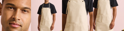 Heavyweight canvas bib apron that can also be folded down to form a half-waist apron. Rounded edges. Gunmetal/antique brass eyelets. Mitred double pocket. Adjustable knotted neckband and matching waist ties that can be fastened to the front or back. Cotton-rich with recycled polyester. Sedex certified.