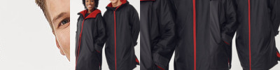 Water-resistant robe with sherpa fleece lining and a three-piece hood. Full double-ended zip down centre front. Zipped pockets with fleece lining. Inner zipped pocket with water-resistant lining. Inner embroidery access zip. Hook and loop fastening at wrist. Side vents. Certified BSCI.