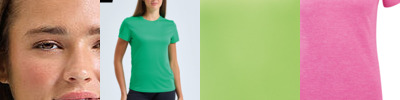 Performance T-shirt. Cationic dyed. Recycled polyester. Wicking fabric. Stretch. Crew Neck. Short Sleeve. Lightweight. Feminine fit. Twin-needle stitching on hem and arms. Textured fabric. Product contains no branded neck or waist label. Removable Kimble or looped garment tags. Inner seam label holds important product information on one label with a second label containing brand information which can be cut-away.