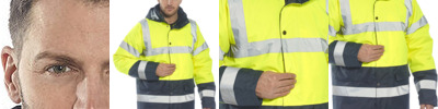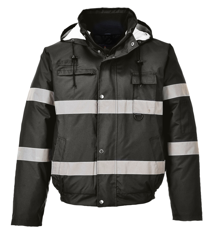 EN343 CLASS 3:1 100% POLYESTER 300D OXFORD WEAVE. PU COATED 190gsm WATERPROFF BOMBER JACKET. FLEECE LINED COLLAR. KNITTED STORM CUFFS. 2 FRONT POCKETS 1 I.D POCKET 1 PHONE POCKET. CONCEALED HOOD.